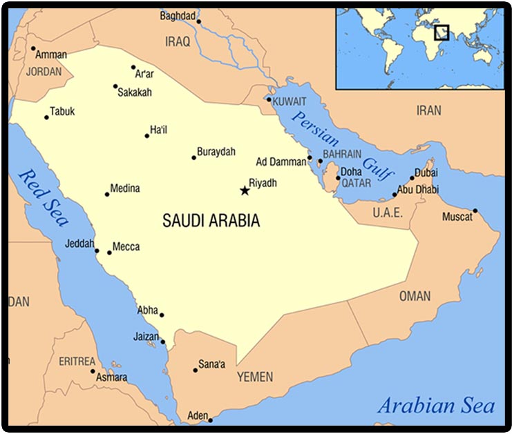 The Kingdom of Saudi Arabia lies between latitudes 12° and 32° North and longitudes 35° and 65° East. It is considered part of the arid and semi-arid regions, with deserts covering a large portion of its land area.