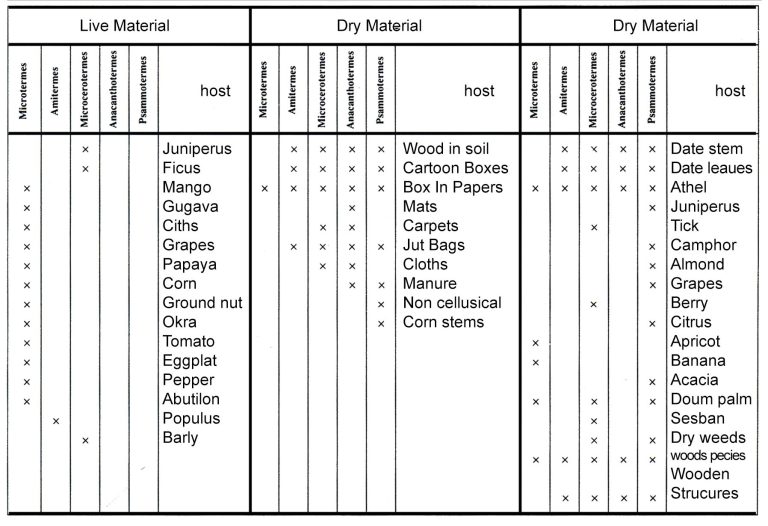 The following table shows the types of hosts, whether dry materials or living organisms, that are attacked or inhabited by the various termite species in the Kingdom of Saudi Arabia.