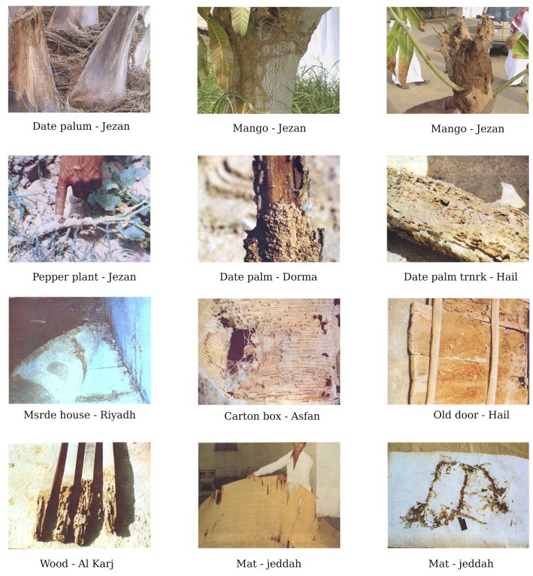 The following images illustrate the damage caused by termites to various dry materials and living plant matter in different regions of the Kingdom.